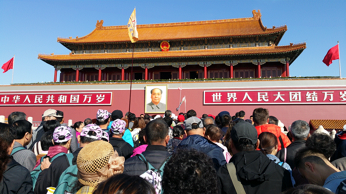Bei solchen Feierlichkeiten wird das Tor zur Verbotenen Stadt als VIP-Tribüne verwendet. Und weil direkt unter der VIP-Trübine dauerhaft ein großes Bild von Mao hängt, ist dieses dann immer im absoluten Brennpunkt der Fernsehbilder zu sehen. Ebenso muss jeder Besucher, der in die Verbotene Stadt will, genau unter diesem Bild hergehen. An Mao kommt man hier also nicht vorbei. Er wird einem regelrecht aufs Auge gedrückt.